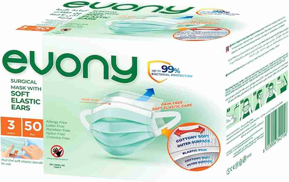 Evony Surgical Face Mask with Soft Elastic Ears, Large – 50 Pieces